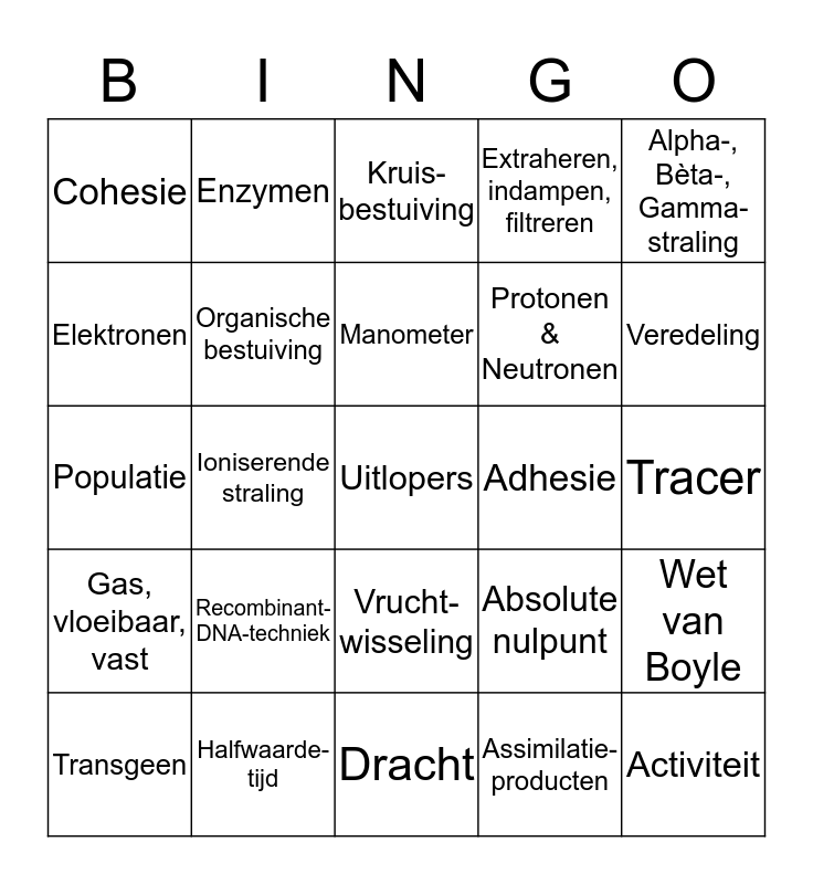 This bingo card has 25 words: Recombinant-DNA-techniek, Dracht, Manometer, Transgeen, Alpha-, Bèta-, Gamma-straling, Cohesie, Elektronen, Enzymen, Adhesie, Vrucht-wisseling, Protonen & Neutronen, Populatie, Absolute nulpunt, Wet van Boyle, Organische bestuiving, Activiteit, Tracer, Kruis-bestuiving, Veredeling, Ioniserende straling, Uitlopers, Halfwaarde-tijd, Gas, vloeibaar, vast, Extraheren, indampen, filtreren and Assimilatie-producten.