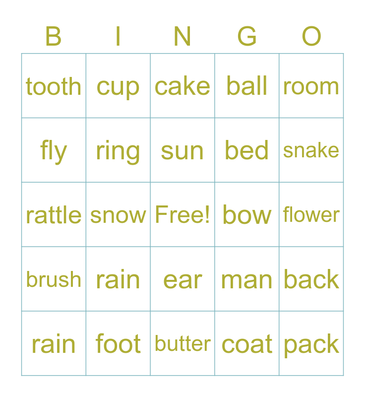 This bingo card has a free space and 24 words: rain, foot, sun, rain, room, tooth, fly, cup, bow, ear, bed, rattle, man, back, ring, coat, flower, cake, snake, snow, pack, brush, ball and butter.