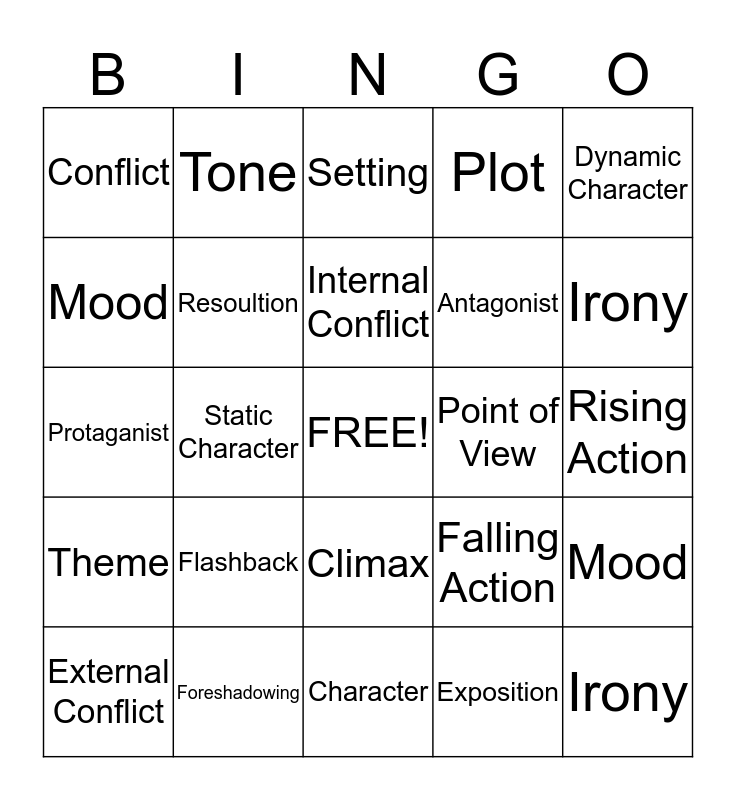 This bingo card has a free space and 24 words: Flashback, Foreshadowing, Internal Conflict, External Conflict, Dynamic Character, Conflict, Mood, Tone, Point of View, Climax, Antagonist, Protaganist, Falling Action, Mood, Resoultion, Exposition, Rising Action, Setting, Irony, Static Character, Irony, Theme, Plot and Character.
