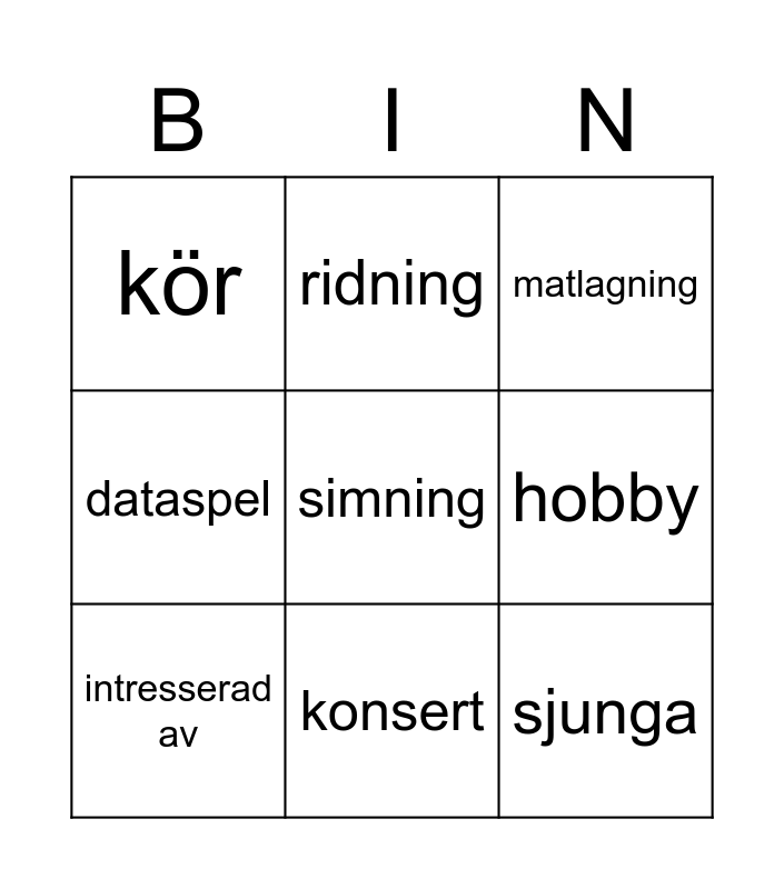 This bingo card has a free space and 23 words: ishockey, musik, konsert, lyssna på musik, sjunga, kör, hobby, ridning, jakt, fotboll, tränar, löpning, dansar, kör, gillar, böcker, matlagning, surfa på nätet, intresserad av, mopeder, dataspel, språk and kändisar.