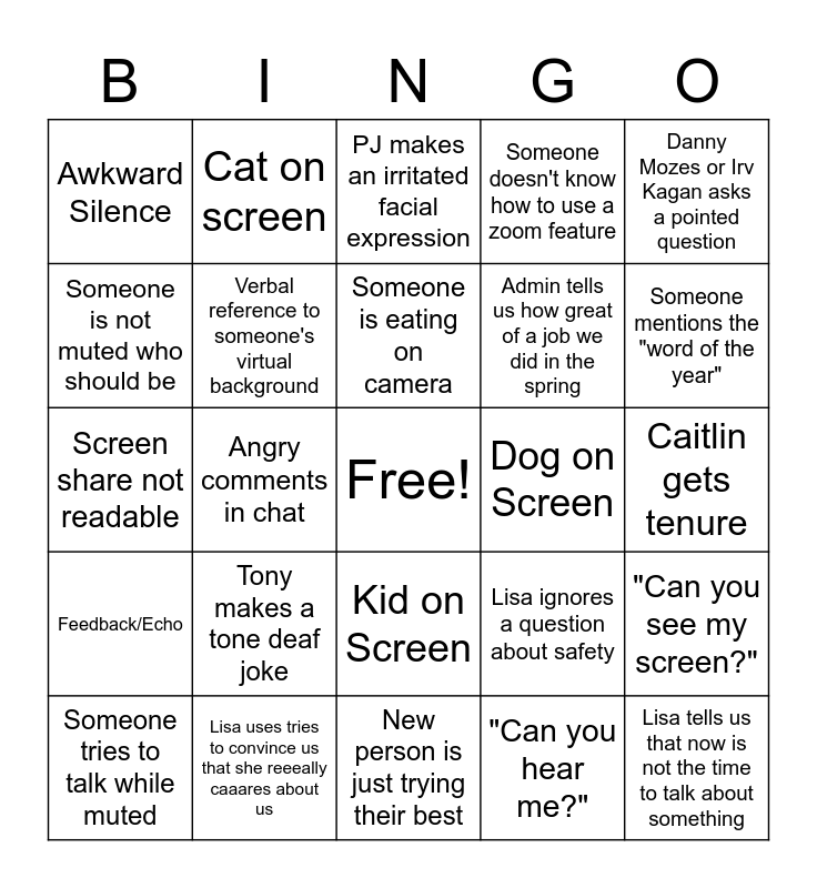 This bingo card has a free space and 24 words: Tony makes a tone deaf joke, Lisa uses tries to convince us that she reeeally caaares about us, Someone is eating on camera, Someone tries to talk while muted, Danny Mozes or Irv Kagan asks a pointed question, Awkward Silence, Someone is not muted who should be, Cat on screen, Dog on Screen, Kid on Screen, Admin tells us how great of a job we did in the spring, Screen share not readable, Lisa ignores a question about safety, "Can you see my screen?", Verbal reference to someone's virtual background, "Can you hear me?", Caitlin gets tenure, PJ makes an irritated facial expression, Someone mentions the "word of the year", Angry comments in chat, Lisa tells us that now is not the time to talk about something, Feedback/Echo, Someone doesn't know how to use a zoom feature and New person is just trying their best.