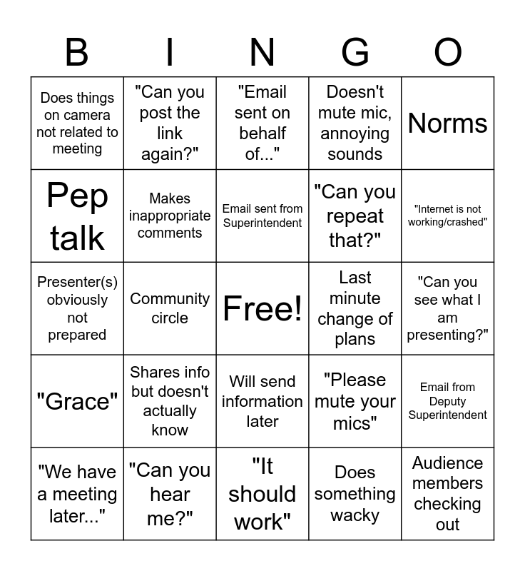 This bingo card has a free space and 27 words: "Please mute your mics", Awkward silence, "Can you repeat that?", "It should work", Pep talk, "Email sent on behalf of...", "Can you post the link again?", "Grace", Last minute change of plans, Email from Deputy Superintendent, Presenter(s) obviously not prepared, Doesn't mute mic, annoying sounds, "We have a meeting later...", "Can you hear me?", "Internet is not working/crashed", Email from Community Relations, Makes inappropriate comments, Email sent from Superintendent, Shares info but doesn't actually know, Does things on camera not related to meeting, "Can you see what I am presenting?", Does something wacky, Community circle, Audience members checking out, Will send information later, Norms and Moment of "real talk".