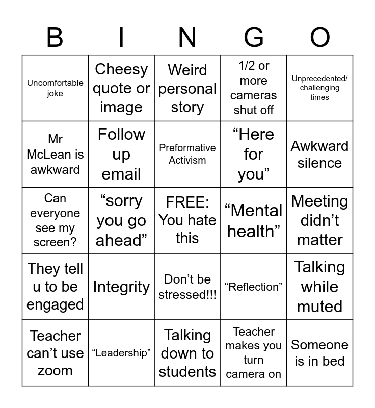 This bingo card has a free space and 24 words: Integrity, “Leadership”, Preformative Activism, Teacher can’t use zoom, Unprecedented/ challenging times, Uncomfortable joke, Mr McLean is awkward, Cheesy quote or image, “Mental health”, Don’t be stressed!!!, “Here for you”, Can everyone see my screen?, “Reflection”, Talking while muted, Follow up email, Teacher makes you turn camera on, Meeting didn’t matter, Weird personal story, Awkward silence, “sorry you go ahead”, Someone is in bed, They tell u to be engaged, 1/2 or more cameras shut off and Talking down to students.