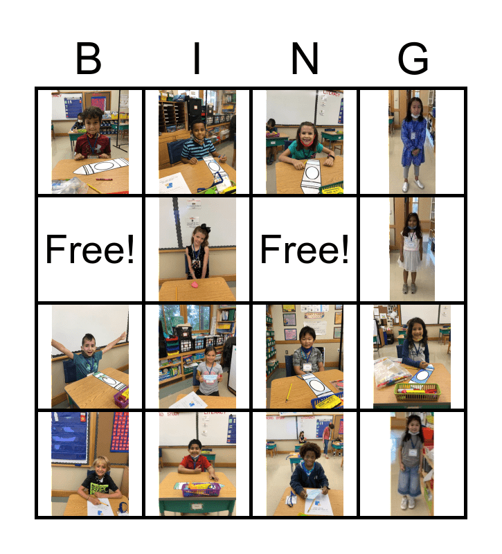 This bingo card has 14 images and 2 words: Free! and Free!.