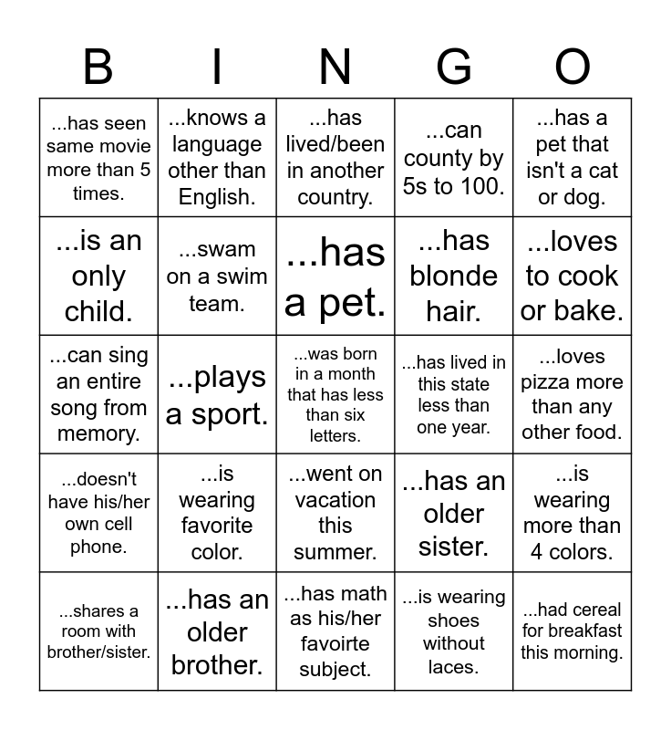This bingo card has 25 words: ...is wearing favorite color., ...has math as his/her favoirte subject., ...has a pet., ...shares a room with brother/sister., ...has a pet that isn't a cat or dog., ...has seen same movie more than 5 times., ...is an only child., ...knows a language other than English., ...has lived in this state less than one year., ...went on vacation this summer., ...has blonde hair., ...can sing an entire song from memory., ...has an older sister., ...is wearing more than 4 colors., ...swam on a swim team., ...had cereal for breakfast this morning., ...loves pizza more than any other food., ...has lived/been in another country., ...loves to cook or bake., ...plays a sport., ...was born in a month that has less than six letters., ...has an older brother., ...doesn't have his/her own cell phone., ...can county by 5s to 100. and ...is wearing shoes without laces..