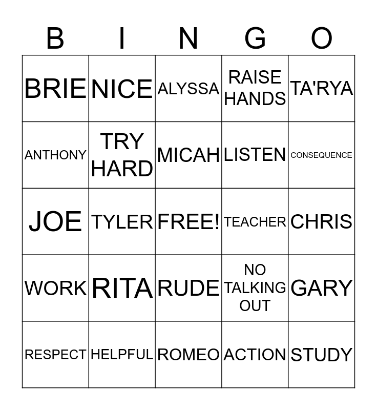 This bingo card has a free space and 24 words: RITA, HELPFUL, MICAH, RESPECT, TA'RYA, BRIE, ANTHONY, NICE, TEACHER, RUDE, LISTEN, JOE, NO TALKING OUT, GARY, TRY HARD, ACTION, CHRIS, ALYSSA, CONSEQUENCE, TYLER, STUDY, WORK, RAISE HANDS and ROMEO.