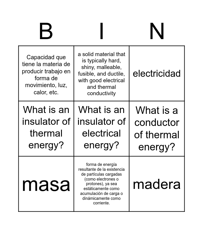 This bingo card has a free space and 17 words: metal, un material que es un mal conductor (como de electricidad o calor), electricidad, Capacidad que tiene la materia de producir trabajo en forma de movimiento, luz, calor, etc., the substance of which a physical object is composed, What is an insulator of thermal energy?, physical property, masa, forma de energía resultante de la existencia de partículas cargadas (como electrones o protones), ya sea estáticamente como acumulación de carga o dinámicamente como corriente., What is a conductor of thermal energy?, metal, plastic, madera, a solid material that is typically hard, shiny, malleable, fusible, and ductile, with good electrical and thermal conductivity, energia, a property (as color, hardness, boiling point) of matter not involving in its manifestation a chemical change and es una medida de la cantidad de materia en un objeto..