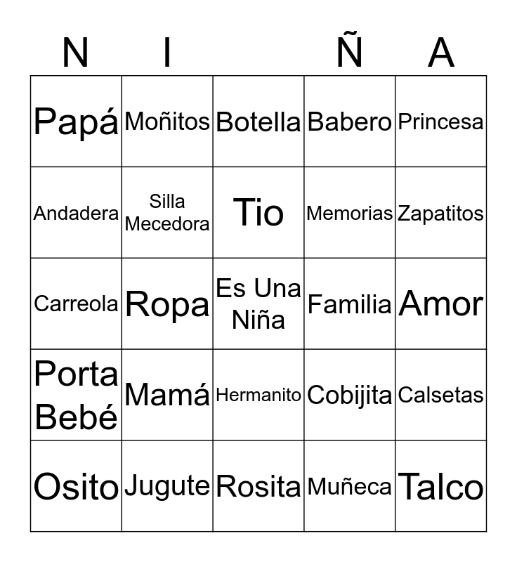 This bingo card has a free space and 24 words: Mamá, Jugute, Tio, Osito, Princesa, Papá, Andadera, Moñitos, Familia, Hermanito, Memorias, Carreola, Cobijita, Calsetas, Silla Mecedora, Muñeca, Amor, Botella, Zapatitos, Ropa, Talco, Porta Bebé, Babero and Rosita.