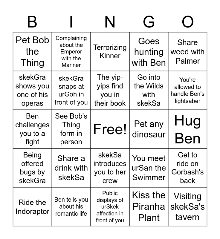 This bingo card has a free space and 24 words: Share a drink with skekSa, Ben tells you about his romantic life, The yip-yips find you in their book, Ride the Indoraptor, Share weed with Palmer, Pet Bob the Thing, skekGra shows you one of his operas, Complaining about the Emperor with the Mariner, Pet any dinosaur, skekSa introduces you to her crew, Go into the Wilds with skekSa, Ben challenges you to a fight, You meet urSan the Swimmer, Get to ride on Gorbash's back, skekGra snaps at urGoh in front of you, Kiss the Piranha Plant, Hug Ben, Terrorizing Kinner, You're allowed to handle Ben's lightsaber, See Bob's Thing form in person, Visiting skekSa's tavern, Being offered bugs by skekGra, Goes hunting with Ben and Public displays of urSkek affection in front of you.