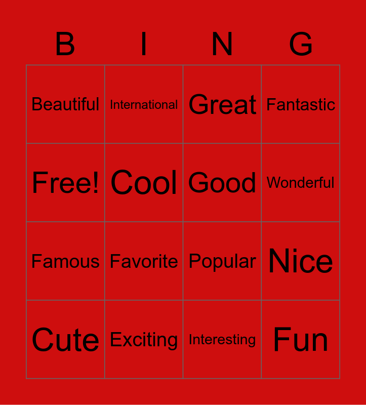 This bingo card has 16 words: Exciting, Nice, Great, Beautiful, Famous, International, Popular, Interesting, Free!, Cool, Cute, Fantastic, Favorite, Wonderful, Good and Fun.