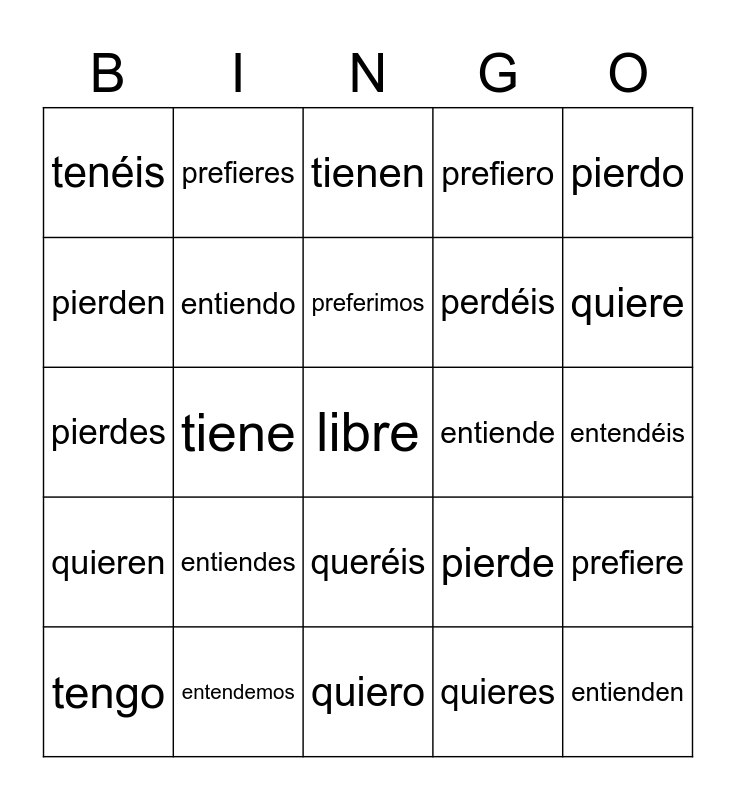 This bingo card has a free space and 29 words: tengo, tienes, tiene, tenemos, tenéis, tienen, entiendo, entiendes, entiende, entendemos, entendéis, entienden, quiero, quieres, quiere, queremos, queréis, quieren, pierdo, pierdes, pierde, perdemos, perdéis, pierden, prefiero, prefieres, prefiere, preferimos and preferís.
