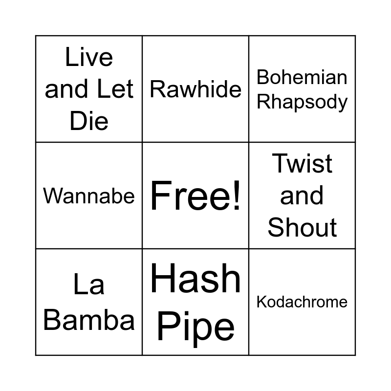 This bingo card has a free space and 19 words: Stay, You Don't Own Me, Bohemian Rhapsody, Rock Me Amadeus, Can't Help Falling in Love, Kodachrome, Dueling Banjos, Live and Let Die, Rawhide, Stayin' Alive, Don't You Forget About Me, Twist and Shout, La Bamba, Mrs. Robinson, 9-5, Grease, Wannabe, Hash Pipe and Undone.