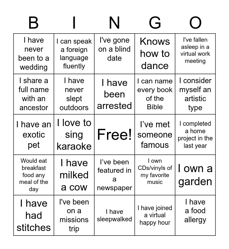 This bingo card has a free space and 24 words: I have milked a cow, I've been on a missions trip, I have been arrested, I have had stitches, I've fallen asleep in a virtual work meeting, I have never been to a wedding, I share a full name with an ancestor, I can speak a foreign language fluently, I’ve met someone famous, I’ve been featured in a newspaper, I can name every book of the Bible, I have an exotic pet, I own CDs/vinyls of my favorite music, I own a garden, I have never slept outdoors, I have joined a virtual happy hour, I completed a home project in the last year, I've gone on a blind date, I consider myself an artistic type, I love to sing karaoke, I have a food allergy, Would eat breakfast food any meal of the day, Knows how to dance and I have sleepwalked.