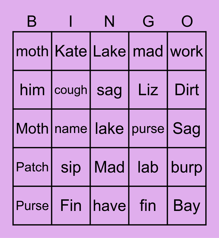 This bingo card has 48 words: dirt, lake, nap, have, sip, hal, Kate, laugh, him, patch, cough, mad, burp, lab, bay, wash, sag, purse, loss, work, name, fin, moth, Liz, Burp, Dirt, Purse, Work, Mad, Patch, Have, Laugh, Liz, Sip, Fin, Him, Hal, Sag, Nap, Lab, Name, Bay, Lake, Kate, Moth, Cough, Wash and Loss.
