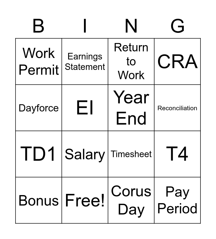 This bingo card has 21 words: Free!, Overtime, Earnings Statement, Direct Deposit, Corus Day, Year End, Work Permit, Return to Work, Timesheet, Reconciliation, TD1, CRA, Pay Period, Accrual, EI, Benefits, Bonus, Salary, Dayforce, T4 and Statutory Holiday.