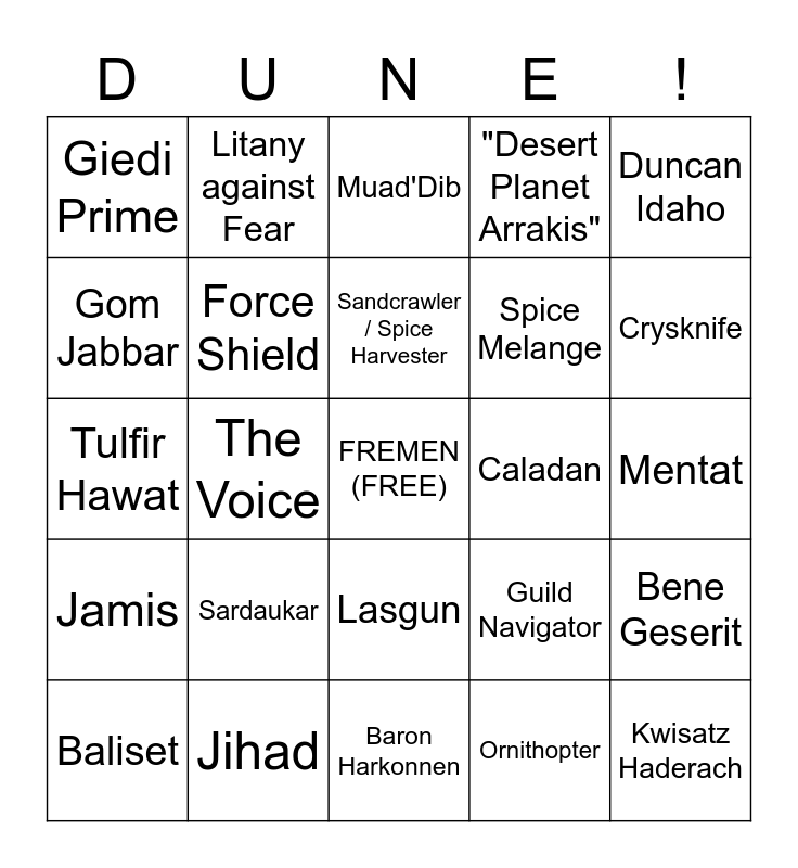 This bingo card has a free space and 29 words: Baliset, Chani, The Voice, Sandworm, Giedi Prime, Muad'Dib, Force Shield, Sardaukar, Caladan, Jihad, Mentat, Kwisatz Haderach, Baron Harkonnen, Ornithopter, Crysknife, Stilsuit, Lasgun, Jamis, Duncan Idaho, Tulfir Hawat, Guild Navigator, Stilgar, Spice Melange, Gom Jabbar, "Desert Planet Arrakis", Litany against Fear, Bene Geserit, Sandcrawler / Spice Harvester and Hunter-Seeker.