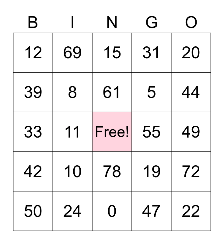 This bingo card has a free space and 24 words: 10, 24, 61, 50, 20, 12, 39, 69, 55, 78, 5, 33, 19, 72, 8, 47, 49, 15, 44, 11, 22, 42, 31 and 0.