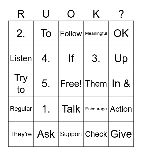 This bingo card has a free space and 24 words: 1., Ask, If, They're, OK, 2., Listen, To, Them, Talk, 3., Try to, Encourage, Action, 4., Check, In &, Follow, Up, 5., Give, Regular, Meaningful and Support.