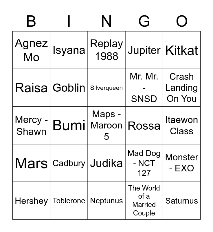 This bingo card has a free space and 24 words: Cadbury, Toblerone, Silverqueen, Hershey, Kitkat, Agnez Mo, Raisa, Isyana, Rossa, Judika, Mr. Mr. - SNSD, Mercy - Shawn, Mad Dog - NCT 127, Monster - EXO, Goblin, The World of a Married Couple, Itaewon Class, Replay 1988, Crash Landing On You, Bumi, Saturnus, Mars, Jupiter and Neptunus.