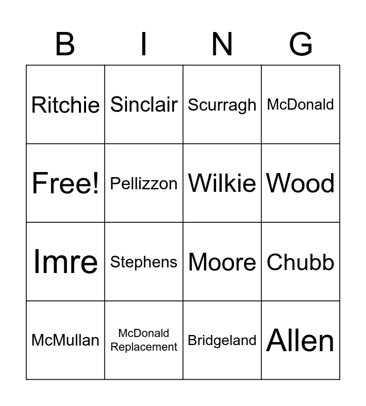 This bingo card has 16 words: McDonald Replacement, Chubb, Scurragh, Ritchie, Imre, Sinclair, Moore, Bridgeland, Free!, Pellizzon, McMullan, McDonald, Stephens, Wood, Wilkie and Allen.