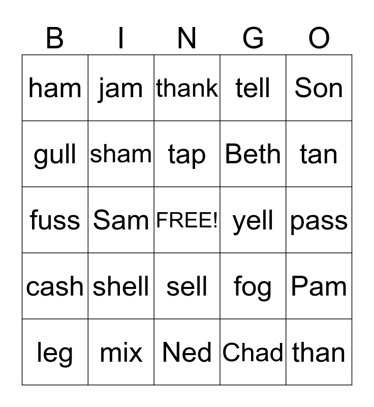 This bingo card has a free space and 24 words: shell, mix, tap, leg, Son, ham, gull, jam, yell, sell, Beth, fuss, fog, Pam, sham, Chad, pass, thank, tan, Sam, than, cash, tell and Ned.