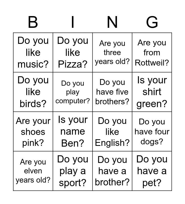 This bingo card has 16 words: Do you play a sport?, Do you have four dogs?, Are you three years old?, Do you like music?, Are your shoes pink?, Do you like Pizza?, Do you like English?, Do you have a brother?, Do you like birds?, Do you play computer?, Are you elven years old?, Are you from Rottweil?, Is your name Ben?, Is your shirt green?, Do you have five brothers? and Do you have a pet?.
