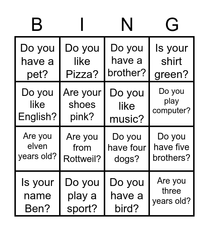 This bingo card has 16 words: Do you play a sport?, Do you have five brothers?, Do you have a brother?, Do you have a pet?, Are you elven years old?, Do you like Pizza?, Do you have four dogs?, Do you have a bird?, Do you like English?, Are your shoes pink?, Is your name Ben?, Is your shirt green?, Are you from Rottweil?, Do you play computer?, Do you like music? and Are you three years old?.