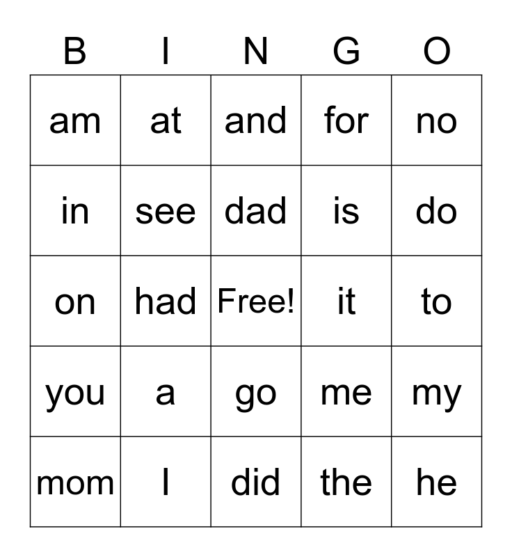 This bingo card has a free space and 24 words: a, I, dad, mom, no, am, in, at, it, go, is, on, me, my, see, the, to, and, do, had, he, you, for and did.