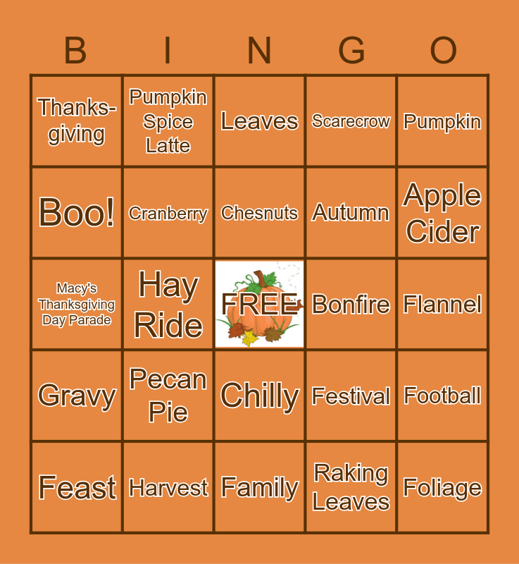 This bingo card has a free space and 69 words: Haunted House, Flannel, Cranberry Sauce, Caramel Apples, Harvest, Costumes, Scarecrow, Turkey, Pumpkin, Wind, Football, Pie, Thanks-giving, Leaves, Mittens, Hay Ride, Chilly, Autumn, November, Gravy, Bonfire, Festival, Apple Cider, Hay Bale Maze, Pumpkin Patch, Jack-O-Lantern, Apple Picking, Cardigan, Raking Leaves, Pilgrims, Pumpkin Spice Latte, October, Candles, Cozy, Food, Spider Web, Stars, Candy Corn, Boo!, Stuffing, Pecan Pie, Foliage, Trick-or-Treat, Baking, Gobble Gobble, Feast, Gourds, Halloween, Sweater, Cranberry, Chesnuts, New School Supplies, Corn Maze, Family, Scarves, Holiday, Black Friday, Hibernate, Pumpkin Pie, Macy's Thanksgiving Day Parade, Fog, September, Cobweb, Hot Cocoa, Tobagan, Movies, Hiking, Cinnamon Pine Cones and Leaf Blowing.