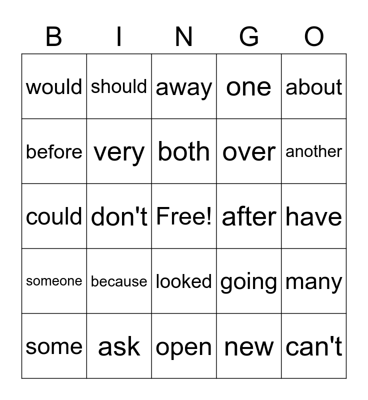 This bingo card has a free space and 24 words: because, ask, both, some, about, would, before, should, after, looked, over, could, going, many, very, new, have, away, another, don't, can't, someone, one and open.