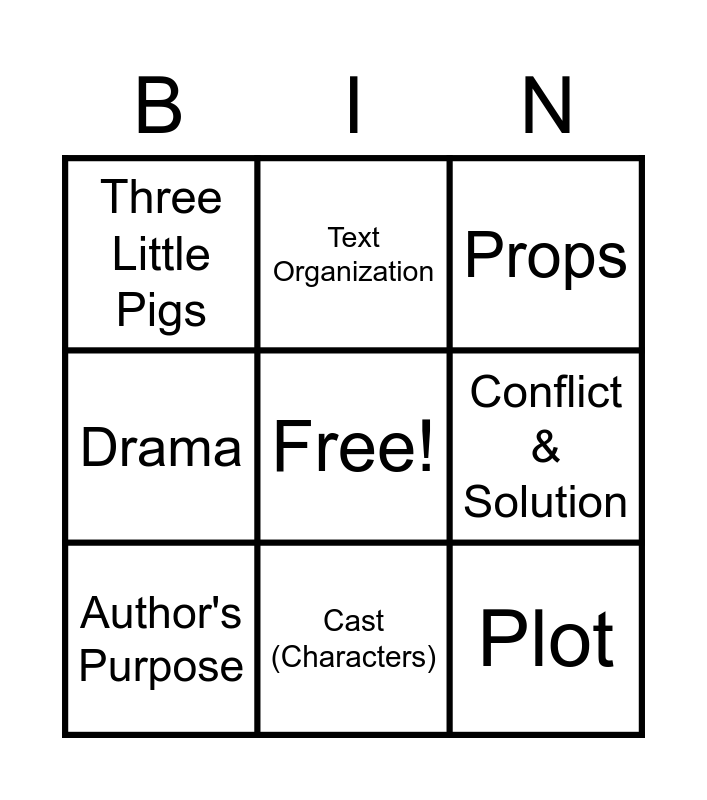 This bingo card has a free space and 11 words: Settings, Cast (Characters), Plot, Author's Purpose, Text Organization, Props, Conflict & Solution, Stage Direction, Drama, Three Little Pigs and Theme.