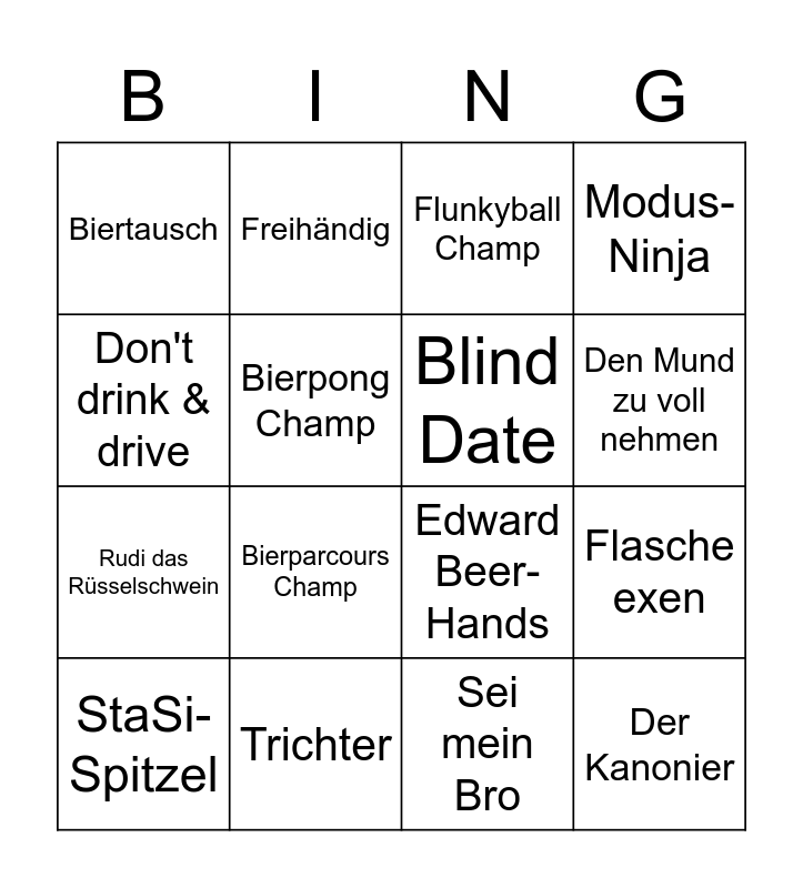 This bingo card has 16 words: Trichter, Flasche exen, Flunkyball Champ, Biertausch, Rudi das Rüsselschwein, Freihändig, Edward Beer-Hands, Sei mein Bro, Don't drink & drive, Bierpong Champ, StaSi-Spitzel, Modus-Ninja, Bierparcours Champ, Den Mund zu voll nehmen, Blind Date and Der Kanonier.
