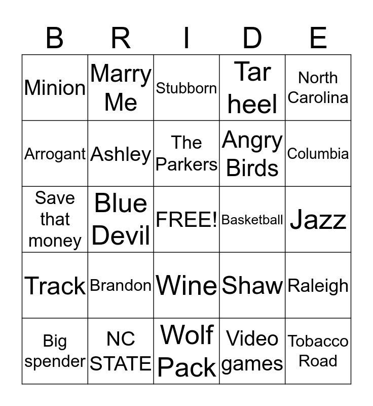 This bingo card has a free space and 28 words: Raleigh, BCBS, Angry Birds, Video games, Arrogant, Stubborn, Marry Me, Track, Basketball, Big spender, Save that money, Tar heel, NC STATE, Wolf Pack, Columbia, Shy, Brandon, Ashley, The Parkers, Wine, Minion, Firebirds, Tobacco Road, Blue Devil, Jazz, Shaw, North Carolina and Victoria's Secret.