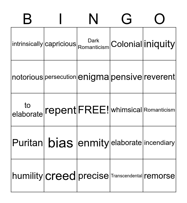 This bingo card has a free space and 24 words: bias, creed, enigma, humility, iniquity, intrinsically, notorious, capricious, whimsical, enmity, pensive, to elaborate, elaborate, incendiary, persecution, Transcendental, Romanticism, Dark Romanticism, reverent, repent, remorse, Puritan, Colonial and precise.