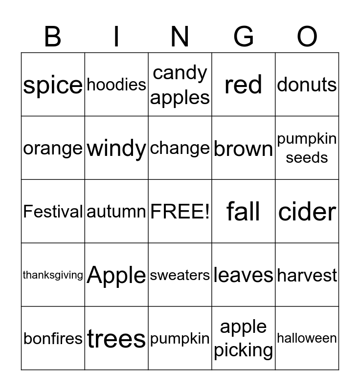 This bingo card has a free space and 24 words: Apple, trees, change, bonfires, donuts, spice, orange, hoodies, fall, sweaters, brown, Festival, leaves, harvest, windy, apple picking, cider, candy apples, pumpkin seeds, autumn, halloween, thanksgiving, red and pumpkin.