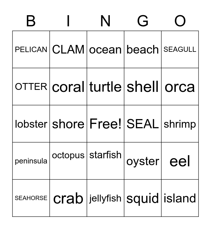 This bingo card has a free space and 24 words: octopus, crab, turtle, SEAHORSE, SEAGULL, PELICAN, OTTER, CLAM, SEAL, starfish, shell, lobster, oyster, eel, coral, squid, shrimp, ocean, orca, shore, island, peninsula, beach and jellyfish.