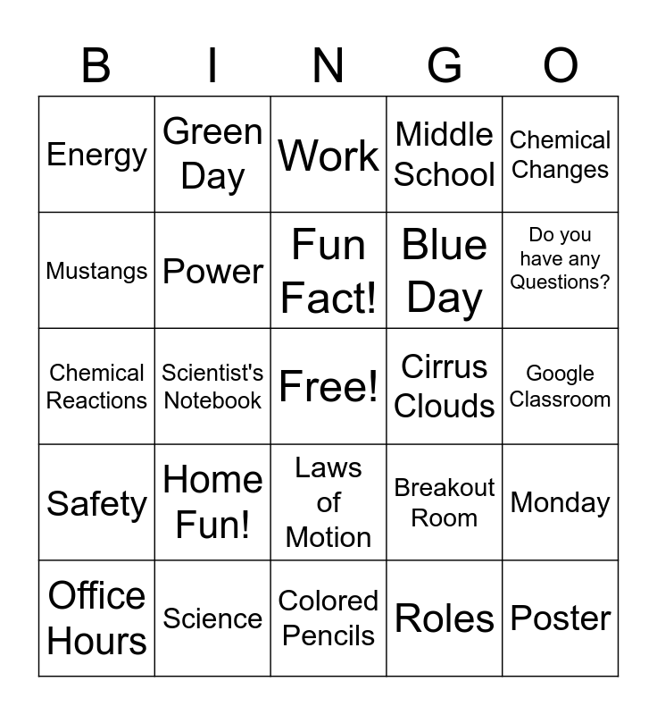 This bingo card has a free space and 30 words: Science, Composition Book, Scientist's Notebook, Matter, Energy, Work, Power, Laws of Motion, Cirrus Clouds, Colored Pencils, Google Classroom, Poster, Roles, Timer, Do you have any Questions?, BBCU, Breakout Room, Safety, Home Fun!, Chemical Changes, Chemical Reactions, Gravity, Green Day, Blue Day, Mustangs, Middle School, Monday, Office Hours, Fun Fact! and Goldfish.