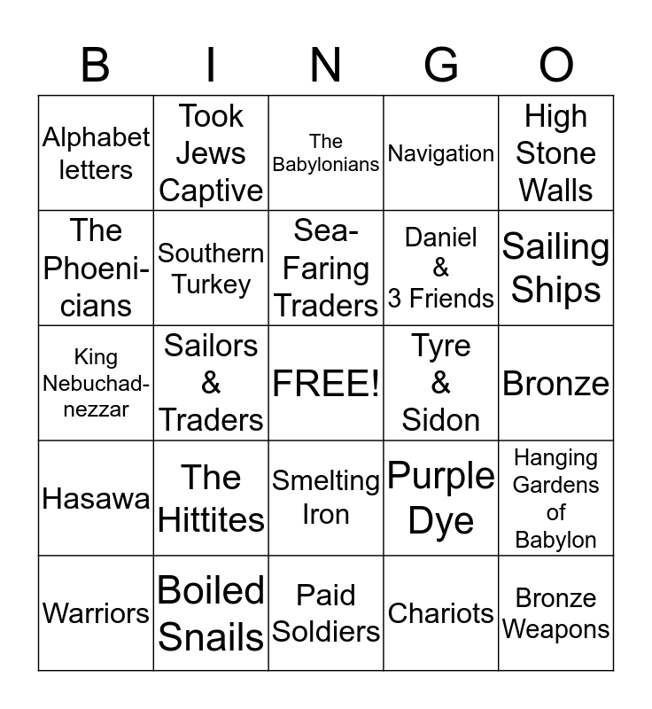 This bingo card has a free space and 24 words: The Hittites, Boiled Snails, Sea- Faring Traders, Warriors, High Stone Walls, Alphabet letters, The Phoeni- cians, Took Jews Captive, Tyre & Sidon, Smelting Iron, Daniel & 3 Friends, King Nebuchad- nezzar, Purple Dye, Hanging Gardens of Babylon, Southern Turkey, Chariots, Bronze, The Babylonians, Sailing Ships, Sailors & Traders, Bronze Weapons, Hasawa, Navigation and Paid Soldiers.