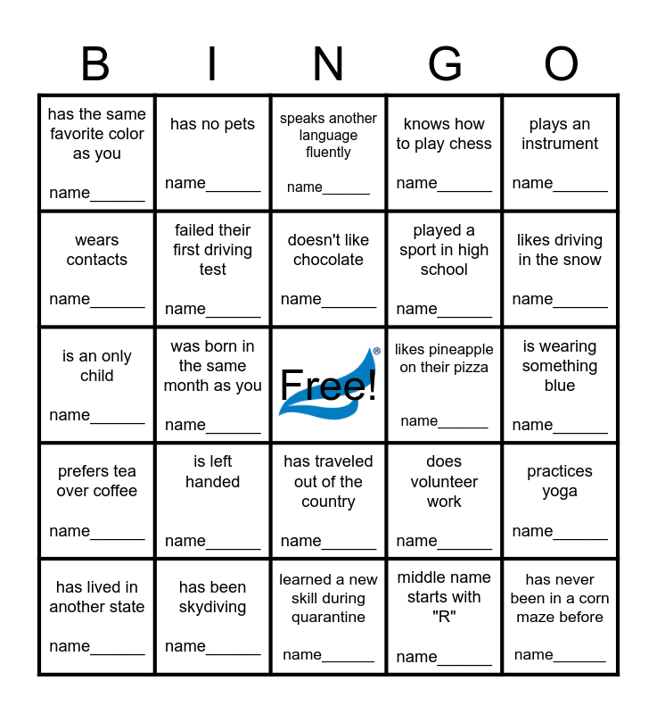 This bingo card has a free space and 24 words: is left handed name______, has been skydiving name______, doesn't like chocolate name______, has lived in another state name______, plays an instrument name______, has the same favorite color as you name______, wears contacts name______, has no pets name______, likes pineapple on their pizza name______, has traveled out of the country name______, played a sport in high school name______, is an only child name______, does volunteer work name______, practices yoga name______, failed their first driving test name______, middle name starts with "R" name______, is wearing something blue name______, speaks another language fluently name______, likes driving in the snow name______, was born in the same month as you name______, has never been in a corn maze before name______, prefers tea over coffee name______, knows how to play chess name______ and learned a new skill during quarantine name______.