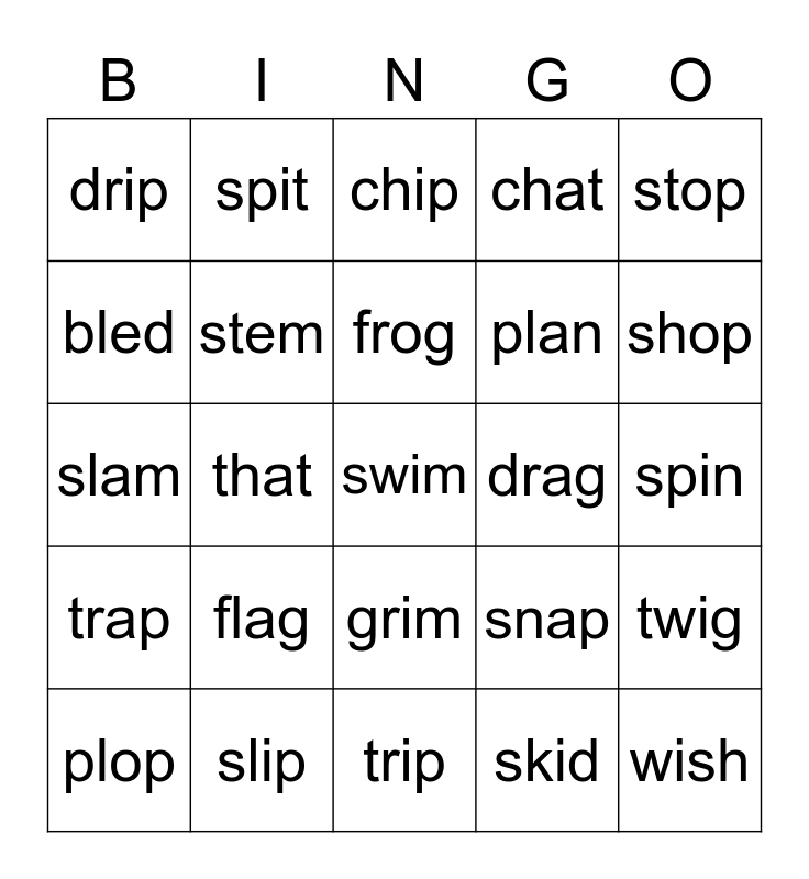 This bingo card has a free space and 24 words: flag, slip, frog, plop, stop, drip, bled, spit, drag, grim, plan, slam, snap, twig, stem, skid, spin, chip, shop, that, wish, trap, chat and trip.
