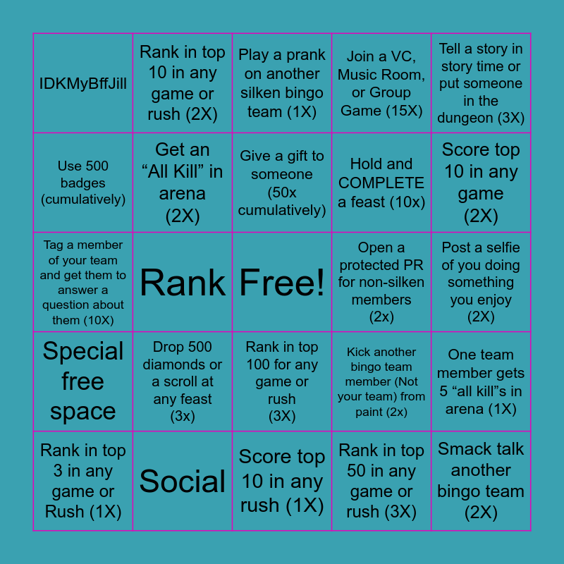 This bingo card has a free space and 30 words: Social, Naughty, Rank, Nice, IDKMyBffJill, Play a prank on another silken bingo team (1X), Get an “All Kill” in arena (2X), Rank in top 100 for any game or rush (3X), Open a protected PR for non-silken members (2x), Score top 10 in any rush (1X), Post a selfie of you doing something you enjoy (2X), Smack talk another bingo team (2X), Rank in top 50 in any game or rush (3X), Hold a Rat Feast (2x), Score top 10 in any game (2X), Post a picture of a current or favorite pet (3X), Kick another bingo team member (Not your team) from paint (2x), Special free space, Drop 500 diamonds or a scroll at any feast (3x), Tell a story in story time or put someone in the dungeon (3X), Tag a member of your team and get them to answer a question about them (10X), Rat a different bingo teams REGULAR feast (2x), Rank in top 10 in any game or rush (2X), Hold and COMPLETE a feast (10x), Use 500 badges (cumulatively), Join a VC, Music Room, or Group Game (15X), One team member gets 5 “all kill”s in arena (1X), Rank in top 3 in any game or Rush (1X), Give a gift to someone (50x cumulatively) and Win a Discord game (2X).