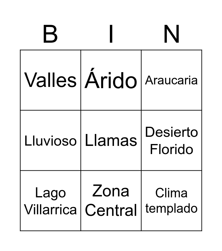 This bingo card has a free space and 17 words: Desierto de Atacama, Zona Norte, Araucaria, Valles, Río Loa, Lluvioso, Zona Sur, Lago Villarrica, Zona Central, Desierto Florido, Cordillera de los Andes, Altiplano, Clima templado, Árido, Zona Agrícola, Ganadería and Actividad Forestal.