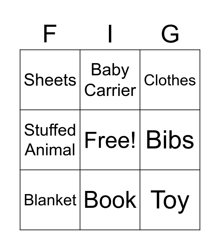 This bingo card has a free space and 11 words: Sippy Cup, Book, Toy, Blanket, Baby Carrier, Clothes, Bibs, Diapers, Stuffed Animal, Sheets and Baby monitor.