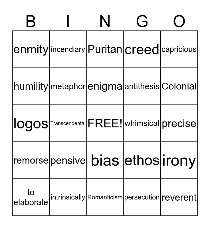 This bingo card has a free space and 24 words: pensive, intrinsically, enigma, to elaborate, capricious, enmity, humility, incendiary, whimsical, bias, antithesis, logos, ethos, irony, metaphor, persecution, precise, Puritan, Colonial, Transcendental, reverent, remorse, creed and Romanticism.