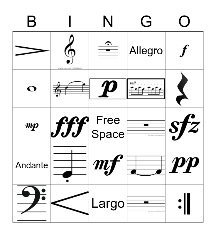 This bingo card has 21 images, a free space and 3 words: Andante, Allegro and Largo.