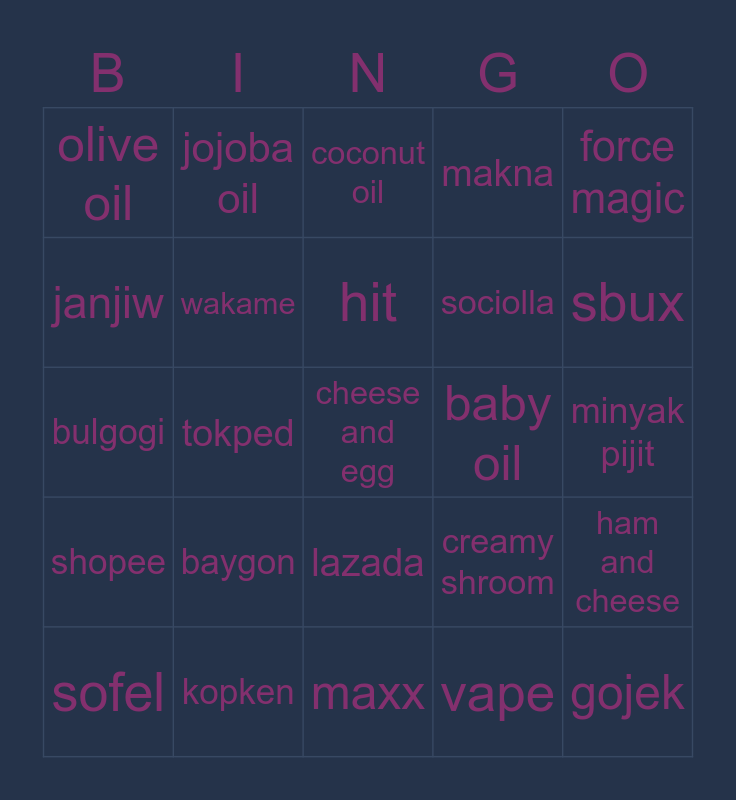 This bingo card has a free space and 24 words: sofel, baygon, hit, vape, force magic, olive oil, jojoba oil, coconut oil, baby oil, minyak pijit, bulgogi, wakame, creamy shroom, ham and cheese, janjiw, kopken, maxx, makna, sbux, shopee, tokped, lazada, sociolla and gojek.