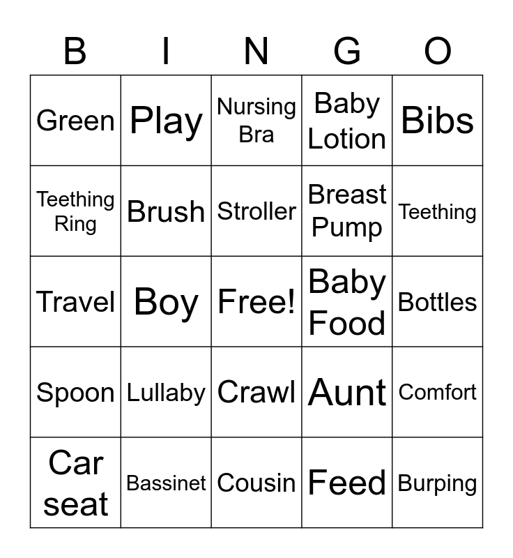 This bingo card has a free space and 74 words: Baby, Receiving Blanket, Stroller, Formula, Girl, Swing, Blue, Crib, Pink, Baby Wipes, Car seat, Diapers, Breast Pump, Bibs, Walker, Bassinet, Wipes, Baby Food, Yellow, Green, Boy, Nursing Bra, Baby Lotion, Bottles, Teething Ring, Rattle, Stuffed Animal, Powder, High Chair, Comb, Brush, Sleeper, Boots, T-Shirt, Crib Sheets, Changing Table, Pediatrician, Vitamins, Burping, Milk, Cereal, Crawl, Laugh, Giggle, Love, Play, Nursery, Sleep, Childcare, Rest, Mom, Dad, Aunt, Uncle, Granny, Grandpa, Cousin, Party, Birthday, Spoon, Lullaby, Bathe, Feed, Comfort, Travel, Visit, Happy, Smile, Teething, Delivery, Hug, Hold, Carry and Grandma.