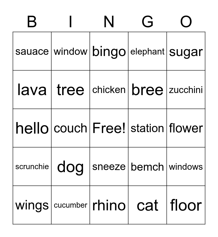This bingo card has a free space and 24 words: dog, cucumber, chicken, wings, sugar, sauace, lava, window, station, sneeze, bree, hello, bemch, windows, tree, cat, flower, bingo, zucchini, couch, floor, scrunchie, elephant and rhino.