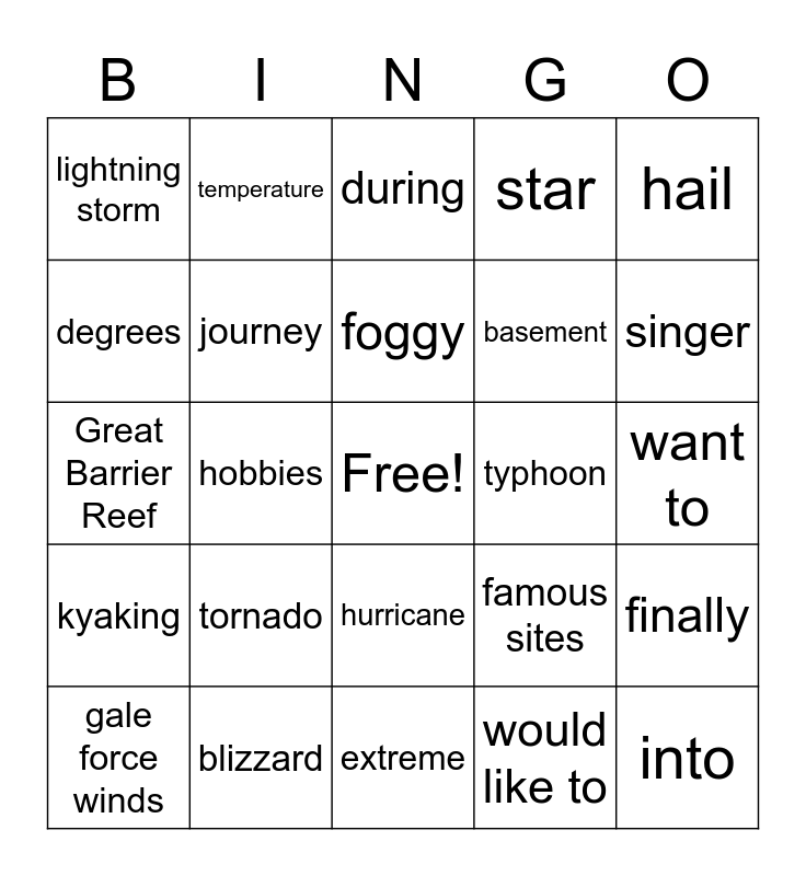 This bingo card has a free space and 24 words: tornado, blizzard, foggy, gale force winds, hail, lightning storm, degrees, temperature, typhoon, hurricane, basement, Great Barrier Reef, famous sites, finally, journey, would like to, want to, during, singer, hobbies, into, kyaking, star and extreme.