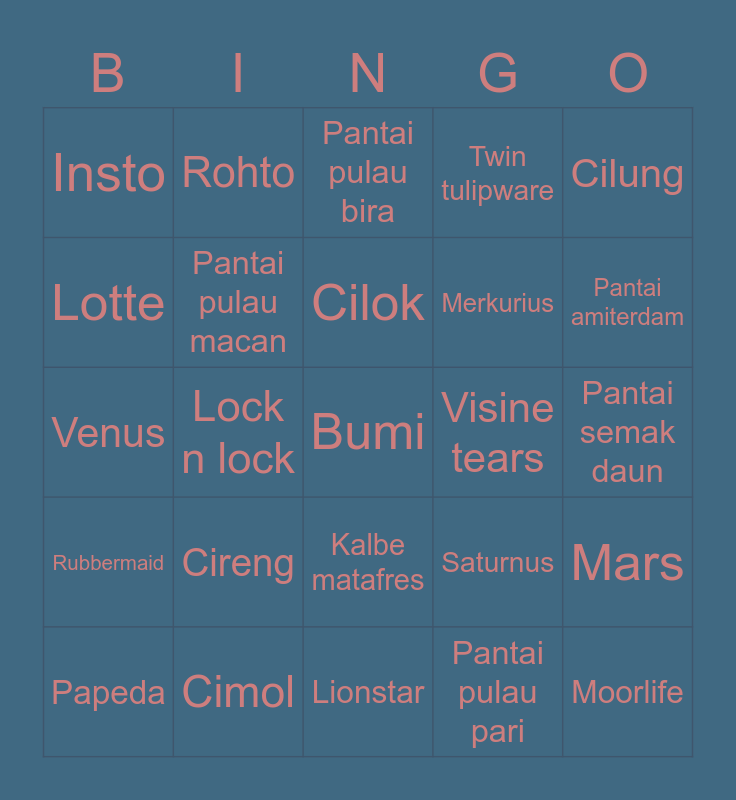 This bingo card has a free space and 24 words: Cireng, Cimol, Cilok, Papeda, Cilung, Insto, Lotte, Rohto, Visine tears, Kalbe matafres, Merkurius, Venus, Saturnus, Mars, Pantai pulau macan, Pantai pulau pari, Pantai semak daun, Pantai pulau bira, Pantai amiterdam, Lock n lock, Moorlife, Rubbermaid, Twin tulipware and Lionstar.